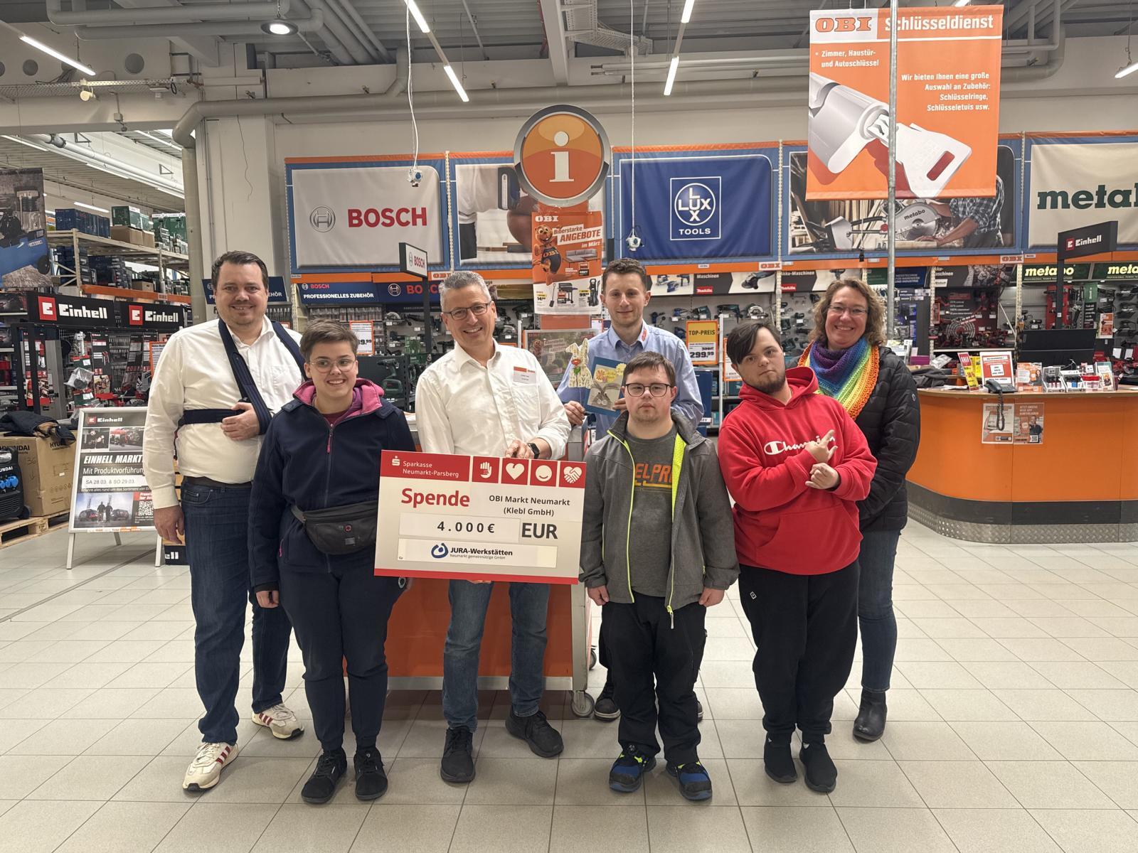 Im Winter 2025 wurde von Stefan Traut, Marktleiter des OBI Markt Neumarkt, die Entscheidung getroffen, dass im Rahmen des Christbaumverkaufs wieder pro verkauftem Baum 1 € für die gute Sache eingesetzt werden und der Lebenshilfe Neumarkt e.V. zugutekommen soll. Über 3.800 Bäume konnten 2025 verkauft werden. Die Spendensumme wurde von OBI auf rund 4.000,00 € aufgestockt. Der erzielte Betrag wird dem Bereich Arbeiten zugutekommen. „Dort soll das Geld zur Förderung des Bildungshauses der Lebenshilfe Neumarkt eingesetzt werden“ äußerte sich Werkstattleitung Sebastian Schauer. „Das Bildungshaus begleitet Menschen mit kognitiven und psychischen Beeinträchtigungen dabei, ihre Talente zu entdecken, ihre Fähigkeiten zu stärken und den passenden Arbeitsplatz zu finden – sei es auf dem allgemeinen Arbeitsmarkt oder innerhalb der JURA-Werkstätten Neumarkt. Die Mittel aus der Spendenaktion sollen insbesondere für die Digitalisierung der Beruflichen Bildung verwendet werden, um etwa iPads für Lehrgänge anzuschaffen. Darüber hinaus sollen verschiedene Angebote des Bildungsprogramms und die Anpassung des Raumkonzepts auf das neue Konzept des Bildungshauses unterstützt werden.“