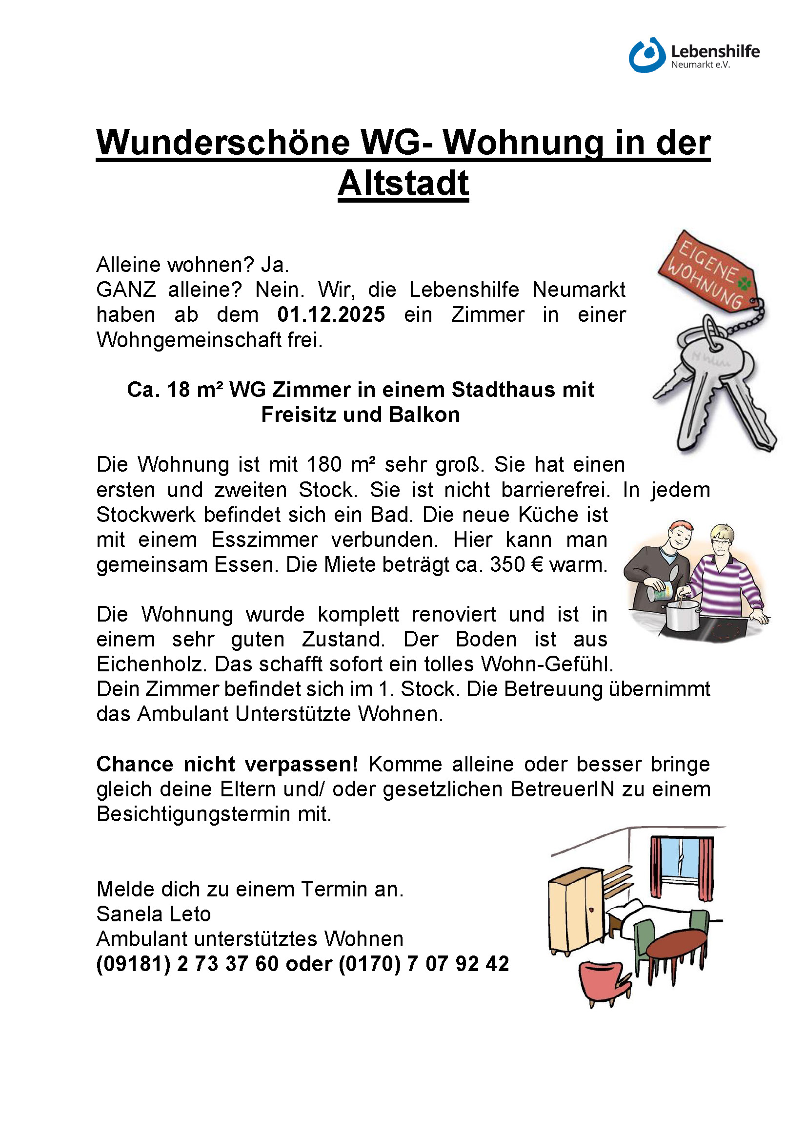 GANZ alleine? Nein. Wir, die Lebenshilfe Neumarkt haben ab dem 01.12.2025 ein Zimmer in einer Wohngemeinschaft frei.