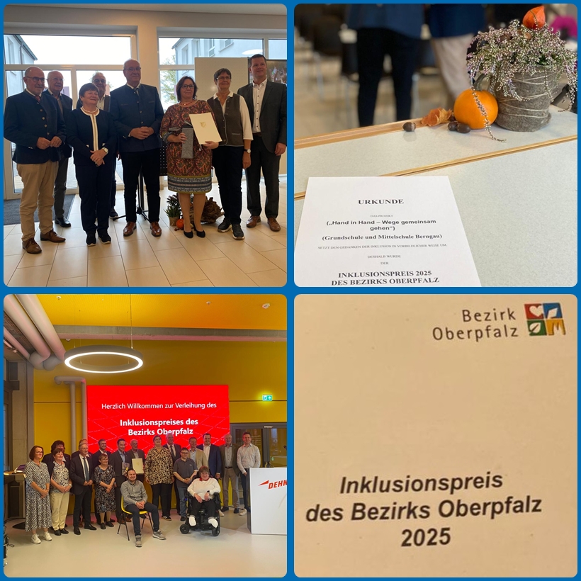 Die Grund- und Mittelschule Berngau bekam den Preis für ihr Schul-Konzept „Hand-in-Hand“ verliehen. Im Rahmen einer Kooperation, welche inzwischen seit zehn Jahren besteht, arbeitet die Schule eng und erfolgreich mit Klassen der Lebenshilfe Neumarkt e.V. zusammen. Kinder, die in der Lebenshilfe betreut werden und die beiden Klassen G1 und M1 besuchen, werden in zwei Außenklassen an der Grund- und Mittelschule Berngau unterrichtet. Die Kooperation geht über gemeinsame Unterrichtseinheiten hinaus, so dass auch Feiern, Feste und andere Veranstaltungen gemeinsam veranstaltet oder besucht werden. Das Preisgeld soll für weitere Spielgeräte auf dem Pausenhof eingesetzt werden, welche gemeinsam ausgesucht werden sollen.
