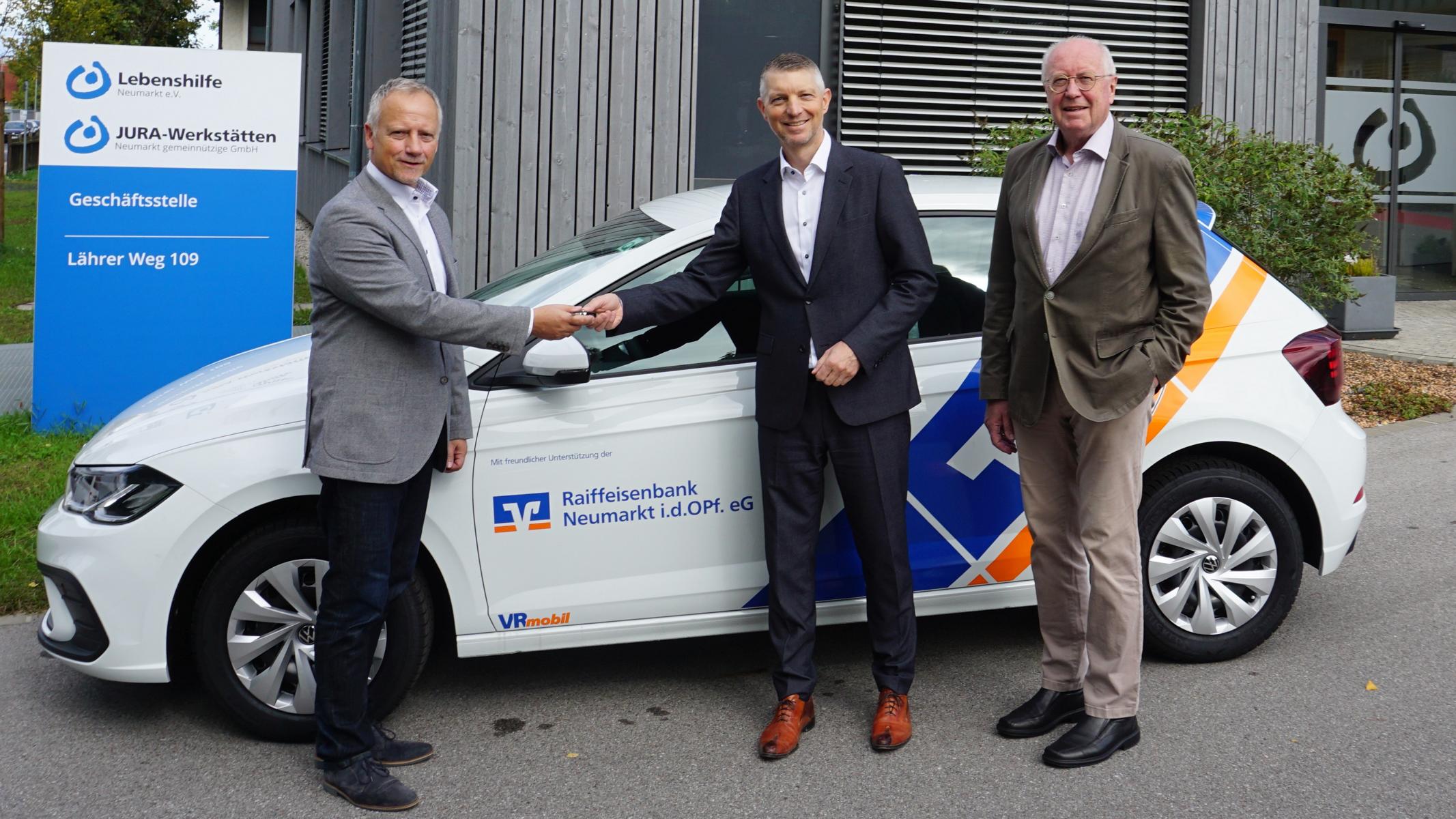 Direktor Markus Bandasch, Vorstand der Raiffeisenbank Neumarkt übergibt die Fahrzeugschlüssel des neuen VRmobils an Herrn Andreas Dauer, Vorstand Personal und Herrn Dr. Wilhelm Baur, 1. Vorsitzenden des Präsidiums der Lebenshilfe Neumarkt e.V.
